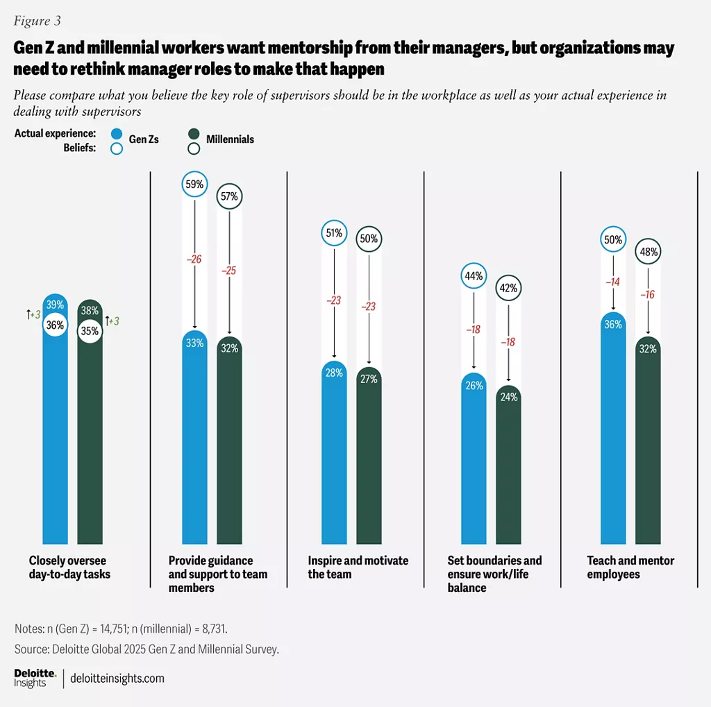 - พวกเขาจึงอยากได้ mentorship และการช่วยตั้งกรอบ (boundaries) เพื่อรักษา work/life balance แต่หลายคนรู้สึกว่าผู้จัดการมัวแต่สนใจ งาน Routine