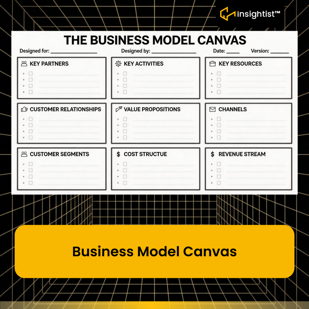 ด้านบนมีหัวเรื่อง The Business Model Canvas และช่องกรอก “Designed for / Designed by / Date / Version”