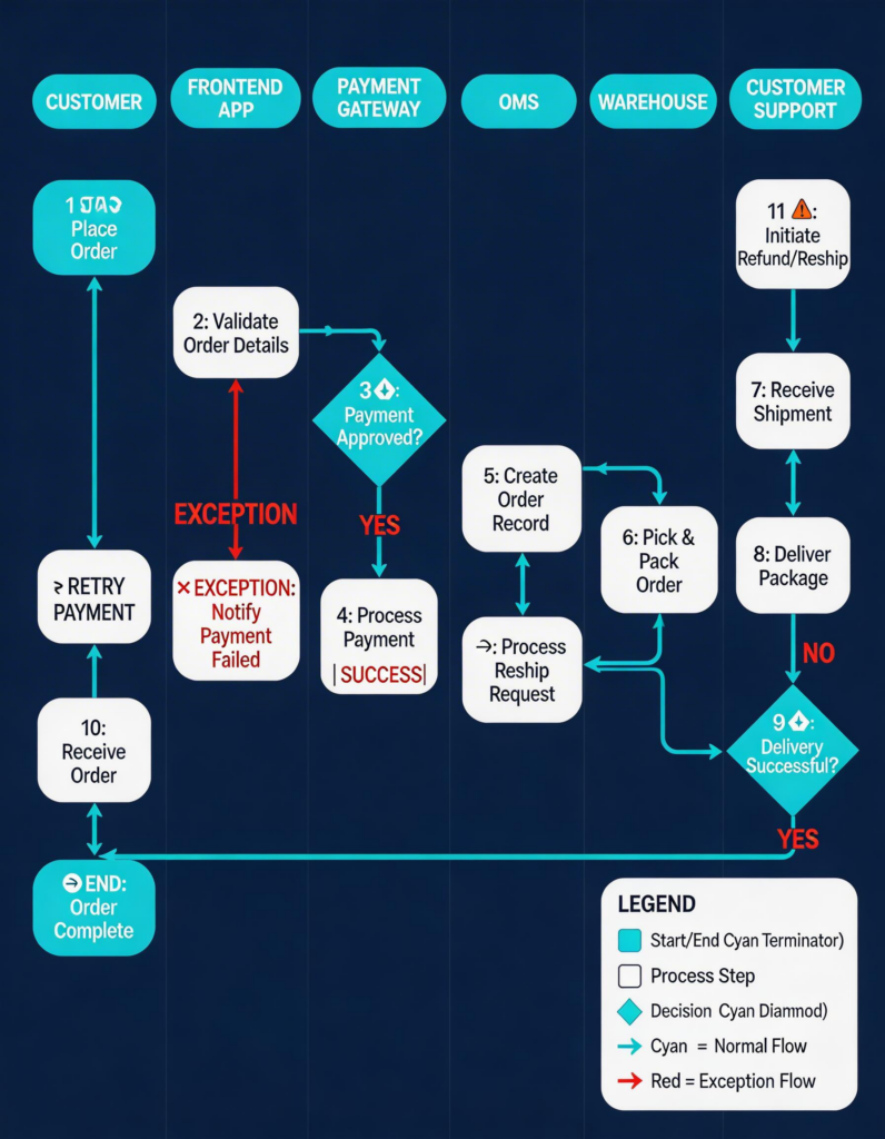 Add swimlanes for roles: Customer, Frontend App, Payment Gateway, OMS, Warehouse, Courier, Customer Support.