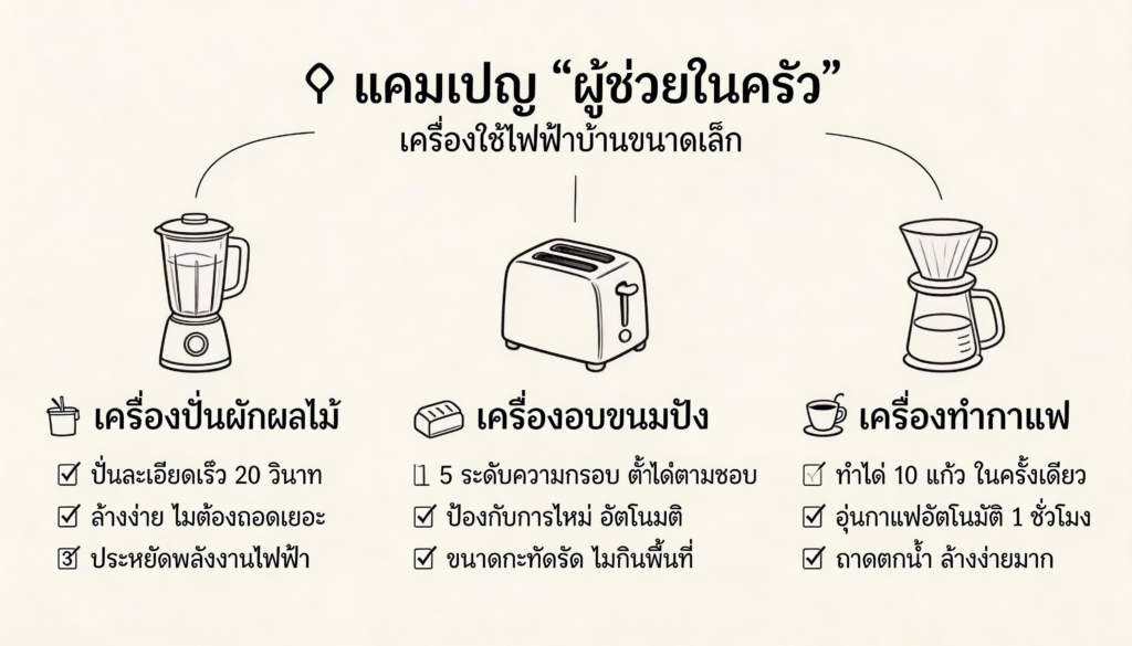 Prompt: I need to organize a “Kitchen Helper” campaign for Small Home Appliances. Please help me draw a mind map idea for the campaign plan. The mind map should show three types of home appliances as primary categories, with hand-drawn icons next to them; for each secondary category, list three main product features to promote. The picture should look professional, Thai Language.