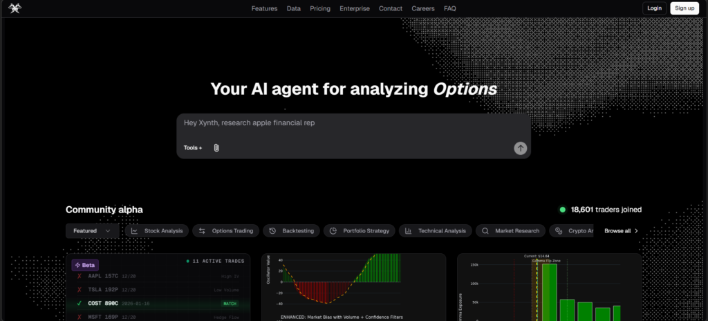 Xynth คือ แพลตฟอร์มแนว AI Trading Terminal ทำหน้าที่เหมือน ผู้ช่วยส่วนตัวที่อยาก วิเคราะห์ Stock / Crypto / Market Research / Strategy โดยใช้วิธีพิมพ์ Prompt แล้วระบบจะไปดึงข้อมูล + จัดเป็นคำตอบ/มุมมองให้เลยในหน้าเดียว