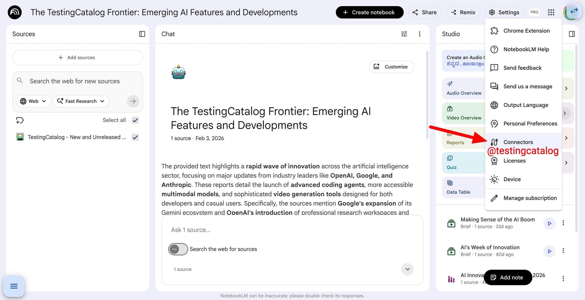 Connectors คือระบบที่อนุญาตให้ NotebookLM ดึงข้อมูลจากบริการอื่นใน Ecosystem ของ Google โดยตรง เช่น Google Drive, Gmail, Calendar หรือ Docs โดยไม่ต้องคัดลอกลิงก์หรืออัปโหลดไฟล์ทีละรายการ ทำให้การทำงานกับข้อมูลขนาดใหญ่เป็นไปอย่างราบรื่นและประหยัดเวลา