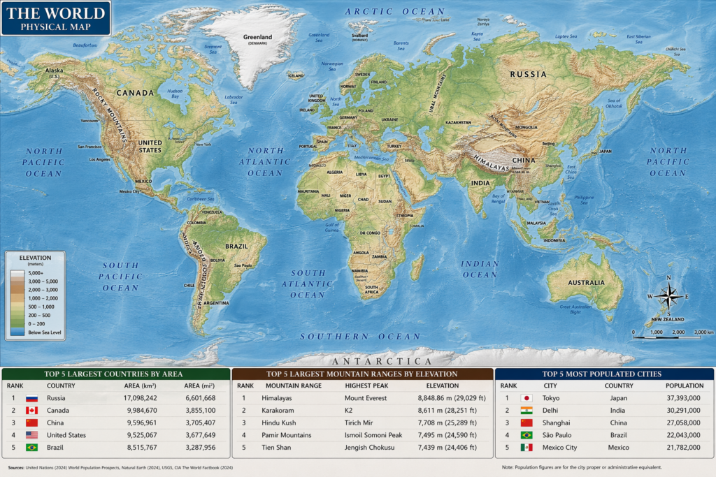 พิมพ์ Prompt ว่า A highly detailed world map in a realistic physical atlas style, showing Earth’s topography with elevation. Continents, countries, major mountain ranges, and oceans labeled clearly. At the bottom, list the top 5 largest countries (include area), largest mountain ranges (include elevation), most populated cities (include population)