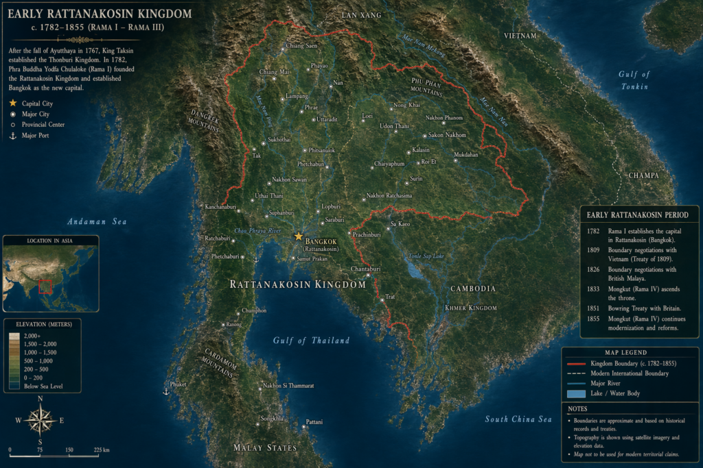 พิมพ์ Prompt ว่า A highly detailed Early Rattanakosin period map in a realistic Satellite imagery style, showing Early Rattanakosin period’s topography with elevation. Continents, countries, major mountain ranges, red Boundary Line and oceans labeled clearly. English Language