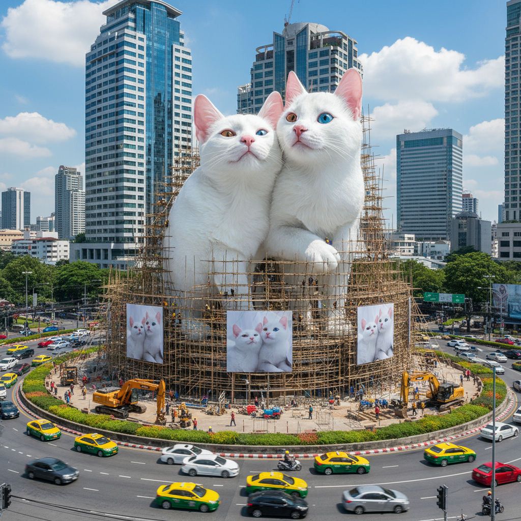 Prompt: สร้างภาพใหม่ เป็นรูปปั้นบุคคลในรูป @img1 ลักษณะคงเดิม 100% ขนาดใหญ่กลางกรุงเทพฯ ย่านสาทร, ปรับผิวสกินโทนให้เหมาะกับแสง, สีสมจริง, คนงานก่อสร้างมากมายกำลังช่วยกันสร้างบนนั่งร้านไม้ไผ่สูง, มีรถก่อสร้าง, ถนนวงเวียนมีรถสัญจรไปมา, อากาศสดใสมีเมฆ, ภาพถ่ายมืออาชีพด้วยกล้อง DSLR fulframe, ตึกมากมาย, ต้นไม้, มีป้ายไวนิลจากรูป ref @img1 ขนาดใหญ่ อยู่ 2-3 ป้าย, แสงทั้งรูปสว่างสดใสสมจริง